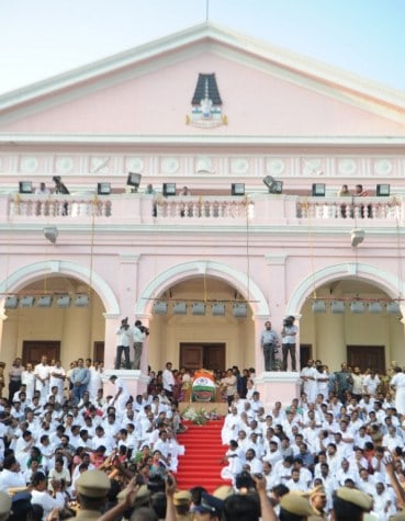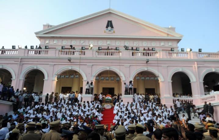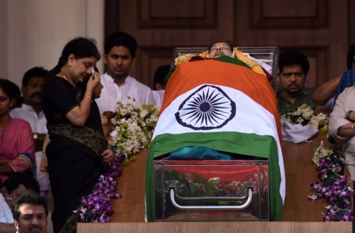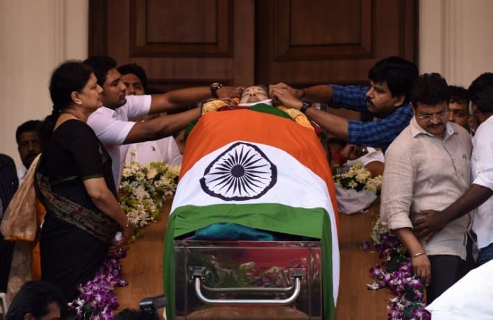چینائی کے راجہ جی حال میں ڈسمبر 6‘2016کو چیف منسٹر ٹاملناڈو کے کافن کے ساتھ ان کے حامی اور وزراء ۔پوری ریاست میں مشہور اور بھگوا ن کی طرح پوجا کی جانے والی قدآور لیڈر کے حامی6ڈسمبر کو اپنے محبوب لیڈر کی موت پر غم زدہ