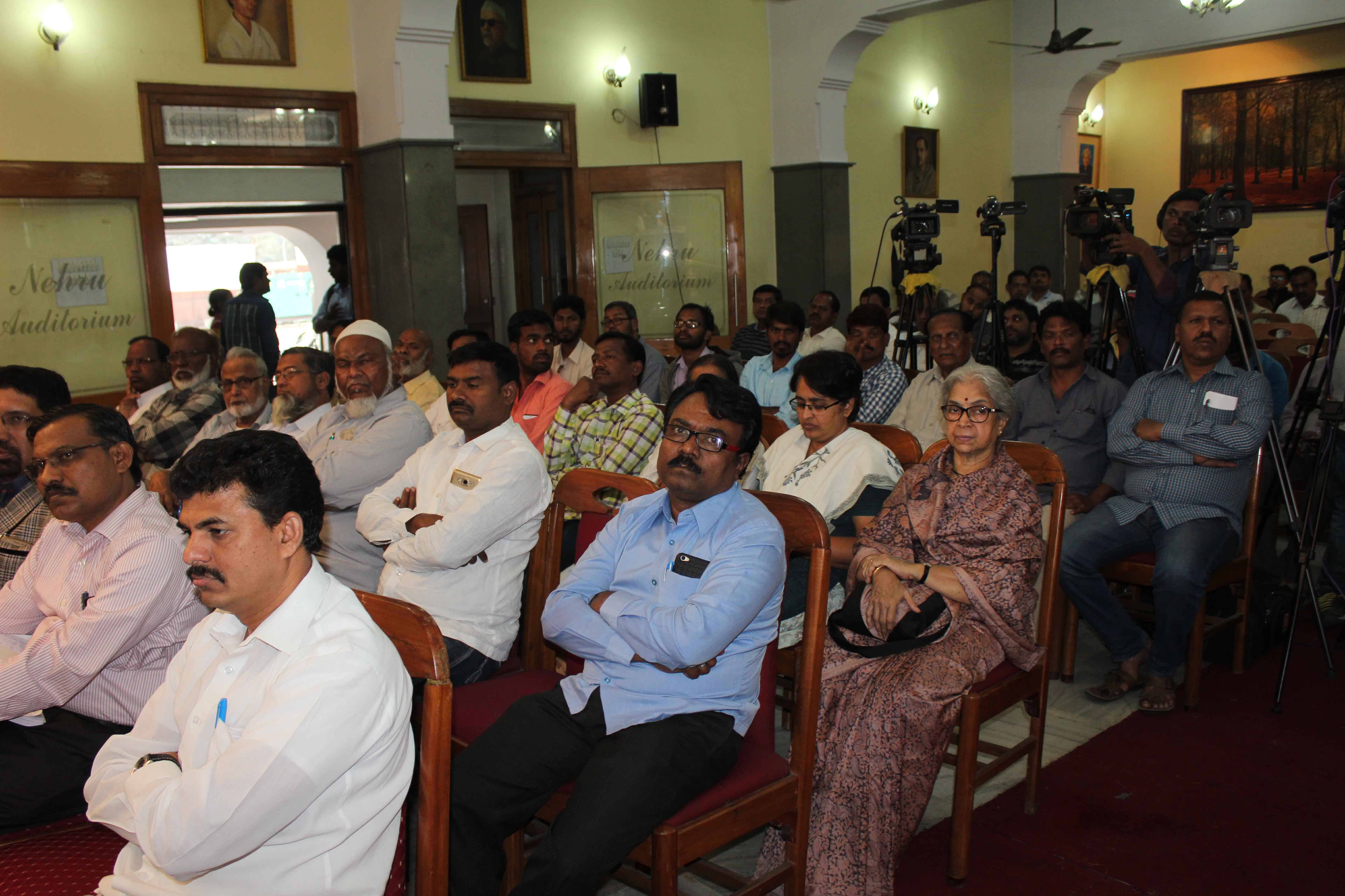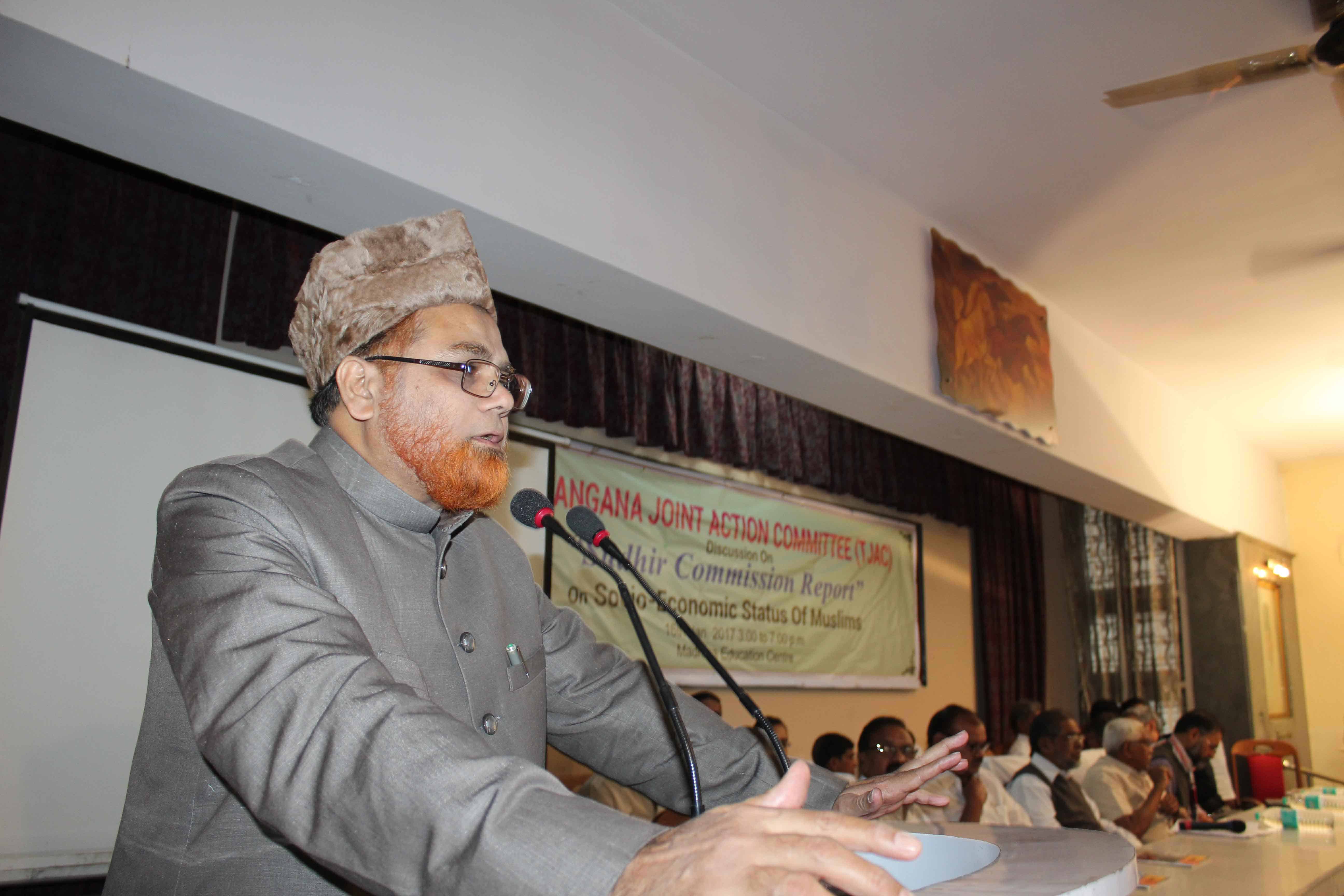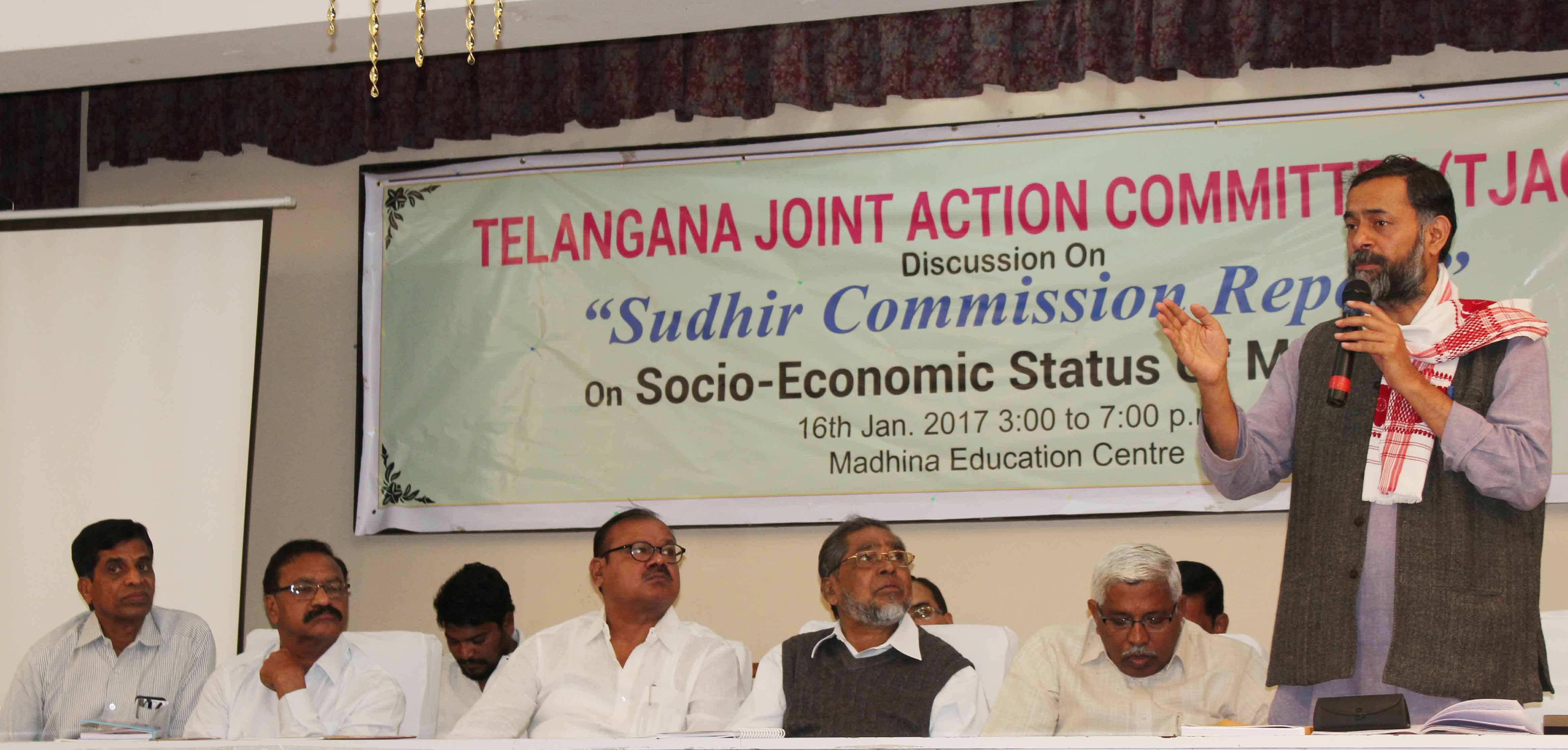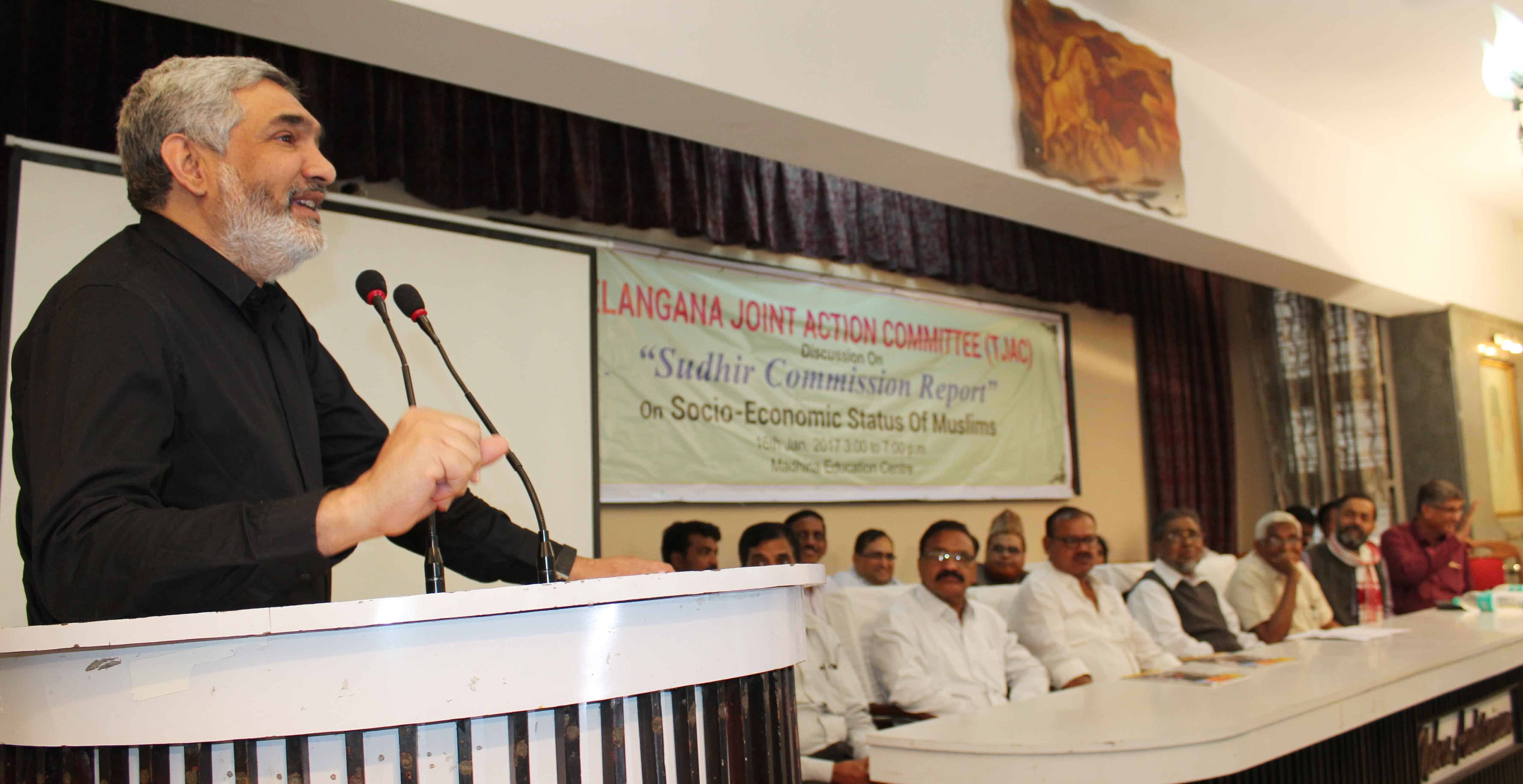 تلنگانہ جوائنٹ ایکشن کمیٹی کے زیر اہتمام اتوار کے روز مدینہ ایجوکیشن سنٹر میں ایک مباحثہ منعقد کیاگیا جس کا عنوان تھا ’’ تلنگانہ میں مسلمانوں کو سماجی او راقتصادی موقف‘‘ جناب ظہیر الدین علی خان کے علاوہ سوراج ابھیان کے قومی صدر یوگیندر یادو‘ ٹی جے اے سی چیرمن پروفیسر کودانڈرام ‘ صدر جماعت اسلامی ہند تلنگانہ واڑیسہ مولانا حامد محمد خان‘ صدر ایم پی جے جناب خواجہ معین الدین ‘ نیشنل کنونیر سوارج ابھیان وامن ویدیکا جناب عادل محمد‘ پروفیسر محمد غوث عثمانیہ یونیورسٹی‘کے علاوہ دیگر نے بھی اس مباحثہ میں حصہ لیتے ہوئے ‘ ریاست تلنگانہ میں مسلمانوں کو حسب وعدہ بارہ فیصد تحفظات فراہم کرنے کا چیف منسٹر تلنگانہ اسٹیٹ کے چندرشیکھر راؤ سے پرزور مطالبہ کیا۔ تصویروں میں عوام کی کثیر تعداد بھی دیکھی جاسکتی ہے ۔ تصوئیر سید اسمعیل ذبیح اللہ