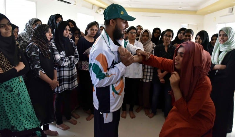 ہیپکیڈو اسوسیشن صدرتلنگانہ محمد ظہیر الدین نے سلطان العلوم کالج آف فارمسی ‘ بنجارہ ہلز ‘ حیدرآباد میں ہفتہ کے روزطالبات کو ’سیلف ڈیفنس‘ کی ٹریننگ دیتے ہوئے دیکھے جاسکتے ہیں۔